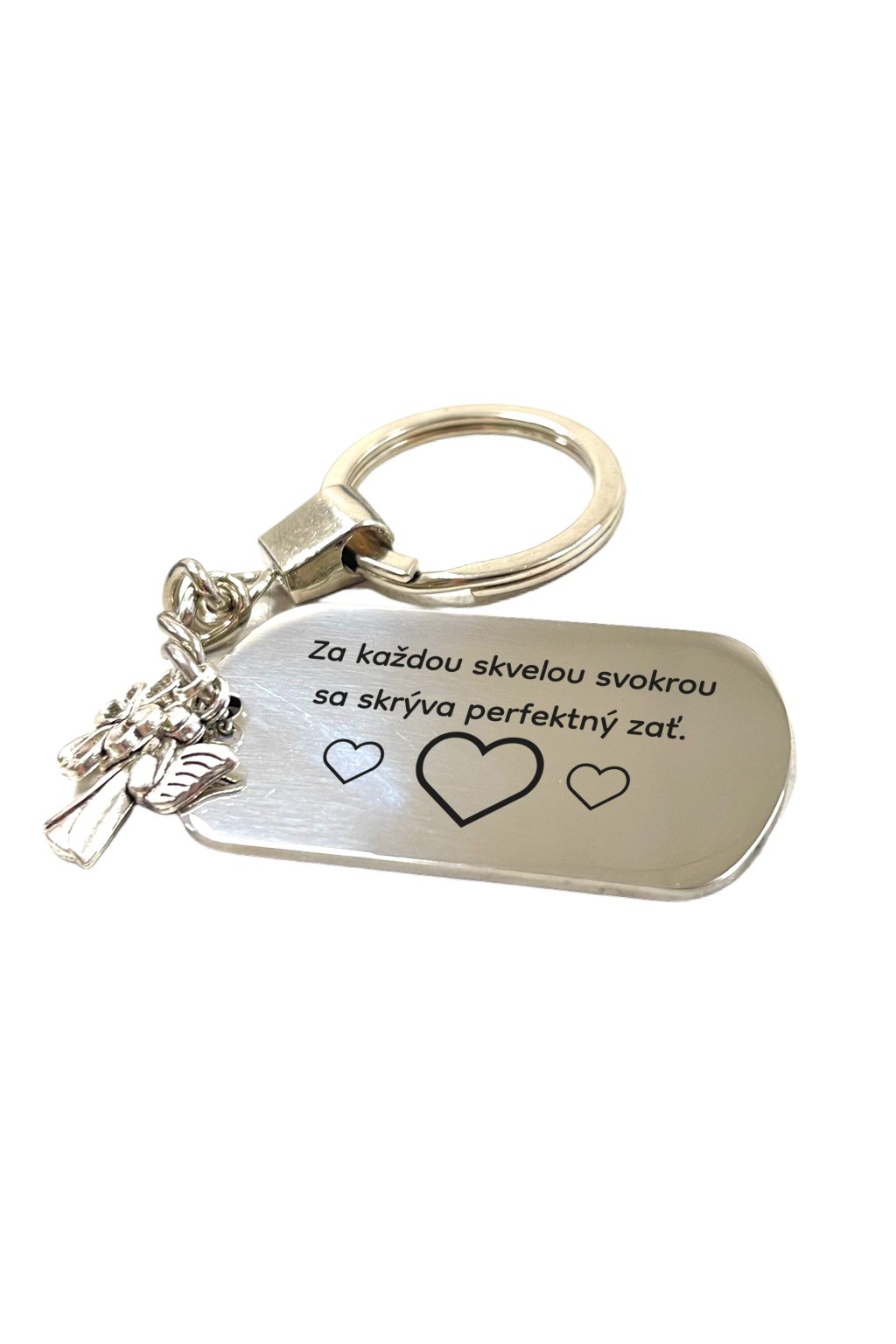 Kľúčenka s gravírovaným textom na štítku zo zrkadlovo leštenej nerezovej ocele. Leštené obojstranne. Všetky časti kľúčenky sú kovové.
